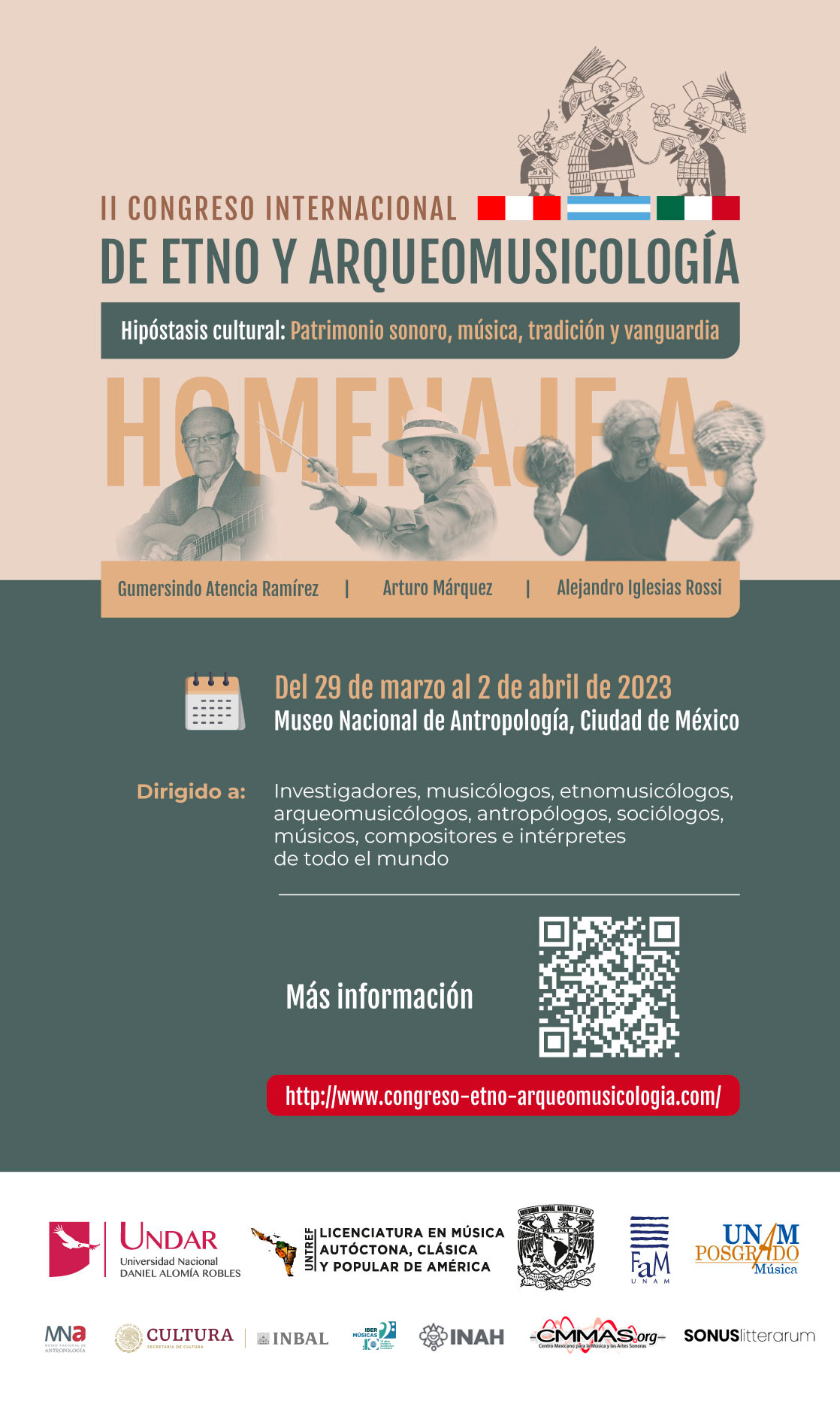 La UNDAR (Huánuco, Perú), UNTREF (Buenos Aires, Argentina) y la UNAM de México, invitan a investigadores, musicólogos, etnomusicólogos, arqueomusicólogos, antropólogos, sociólogos, músicos, compositores e intérpretes de todo el mundo a presentar ponencias y obras de arte sonoro para este Congreso que tendrá como sede al Museo Nacional de Antropología de la Ciudad de México, de manera presencial, del 29 de marzo al 2 de abril de 2023.